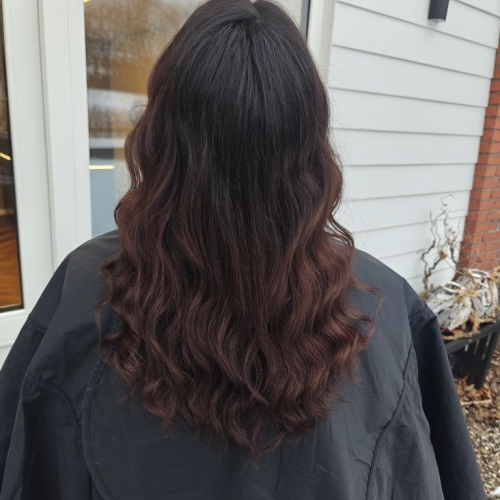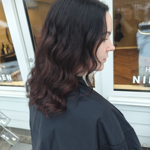 Her er lavet en mørk bundfarve, matchende kundens egen. Blot for dækning af få grå hår - samt en toning ovenpå gammel balayage.